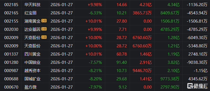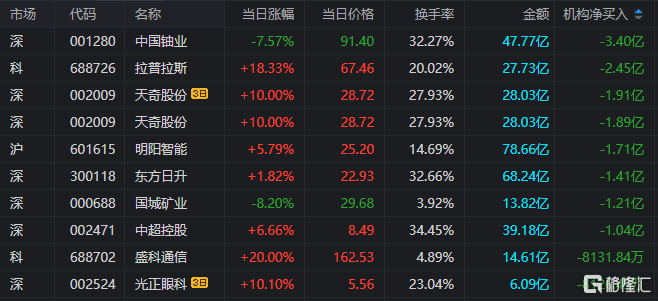 龙虎榜中涉及机构专用席位的个股中,单日净卖出额前三为(wei)中国铀(you)业、拉普拉斯、天(tian)奇股份,离别为(wei)3.40亿元、2.45亿元、1.89亿元。