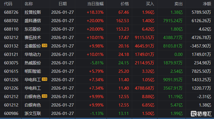 龙虎榜单日净卖出额前三为(wei)中国铀(you)业、东方日升(sheng)、红宝丽,离别为(wei)4.38亿元、3.94亿元、2.52亿元。