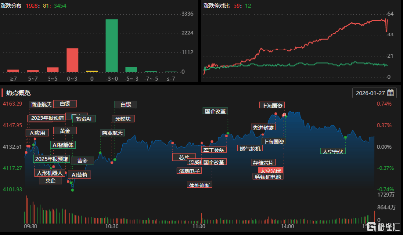 1月27日,沪(hu)指涨0.18%,深(shen)成指涨0.09%,创业板指涨0.71%。全市场成交额2.92万亿元,较前一生意业务日缩量3592亿元,超3400股下跌。贵金属(shu)、培育(yu)钻石、光伏设备、保险、CPO等板块涨幅靠前。