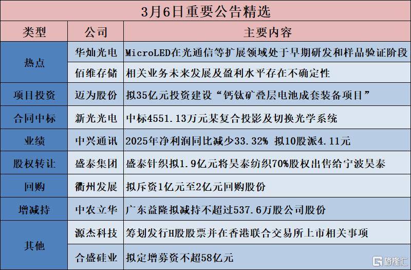 佰维存(cun)储(chu)(688525.SH):相关业(ye)务将来发展及盈利水平存(cun)正在没有确定性(xing) 中国动力(600482.SH):股价存(cun)正在市场情绪过热、非理性(xing)炒作和股价短期快速回落风险(xian) 华灿光电(300323.SZ):针对MicroLED正在光通信等扩展范畴的运用,目前仍处于早期研发和样品考证(zheng)阶段(duan) 【 项 目 投资】 沪电股份(002463.SZ):子公司拟55亿元投资新建印制电路板生(sheng)产项目及其配套办法 绿田机器(605259.SH):拟新建绿田智能制作基地及研发中央(yang)项目 迈为股份(300751.SZ):拟35亿元投资扶植“钙钛矿叠层电池成套装(zhuang)备项目” 迈为股份(300751.SZ):拟15亿元投资扶植“半导体装(zhuang)备研发制作项目” 【中标 合 同 】 通行宝(bao)(301339.SZ):联合体签(qian)定33.77亿元合同 恒华科技(ji)(300365.SZ):中标6.3亿元隆化县100MW风电项目计划采购施工总承包 新光光电(688011.SH):中标4551.13万元某复合投影及切换(huan)光学零碎(sui) 【功绩(ji) 】