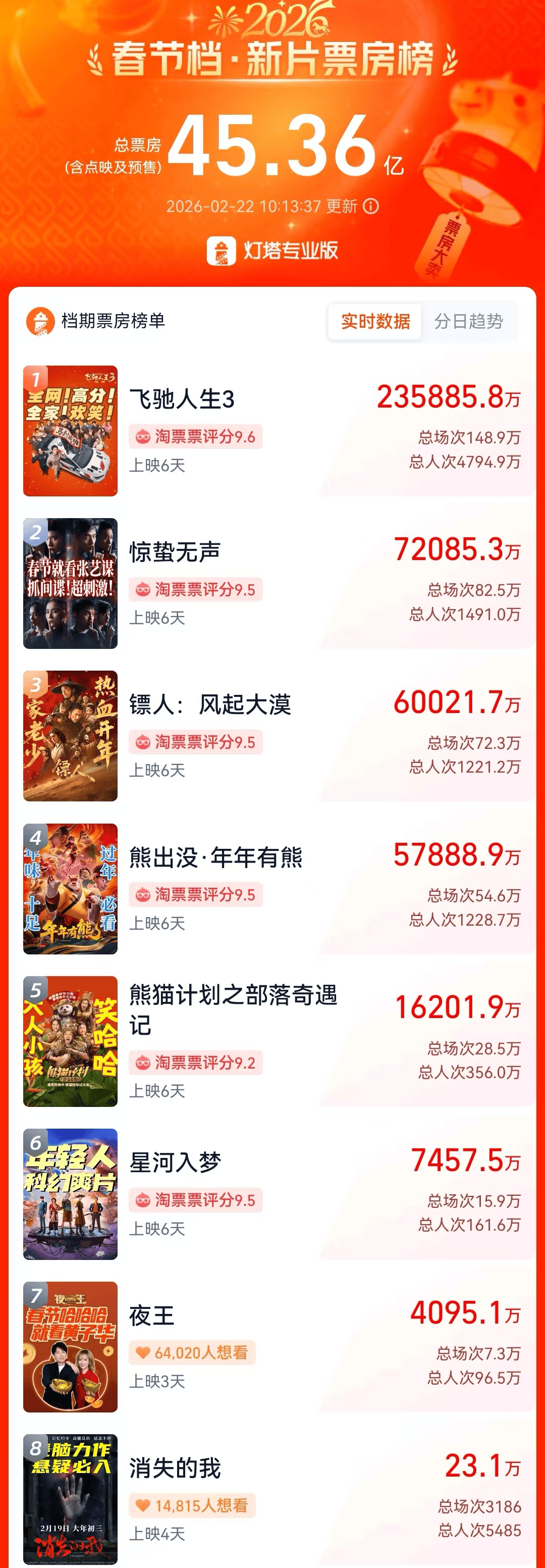 加上预售,《镖人》累计票房冲破(po)了6亿元(yuan)。猫眼专(zhuan)业版预测其终究总票房12亿元(yuan),灯塔专(zhuan)业版的预测提拔到了15.36亿元(yuan)。